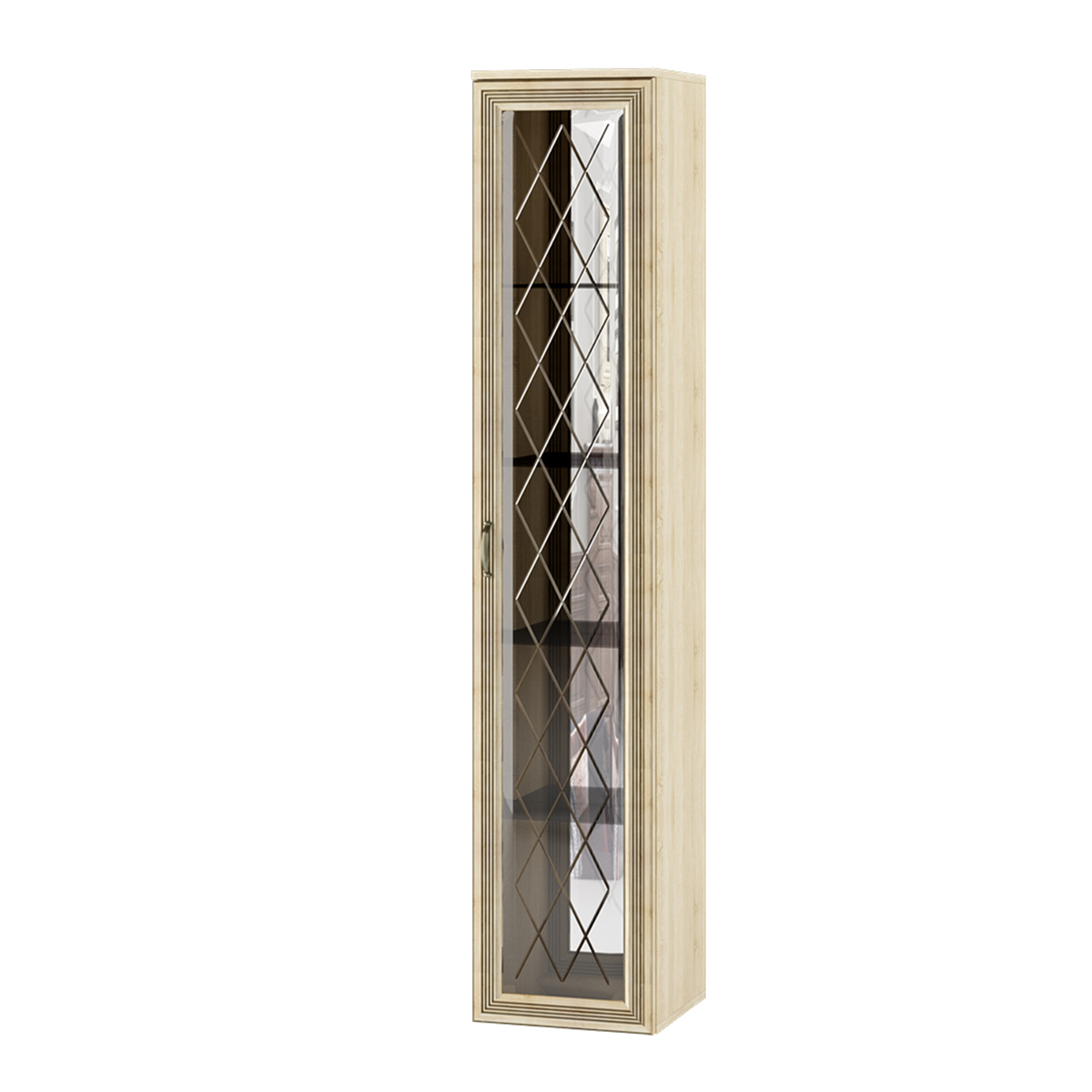 Пенальный шкаф ЛШ-7 создан в духе серии Ливорно и представляет собой узкий шкаф с единственной створкой-витриной. Внутри располагаются четыре стеклянные полки, на которых вы можете разместить декоративные элементы, посуду или любимые сувениры, а задняя стенка шкафа состоит из зеркала. Этот шкаф, определенно, оживит обстановку гостиной и станет яркой деталью, подчеркивающей индивидуальность интерьера.