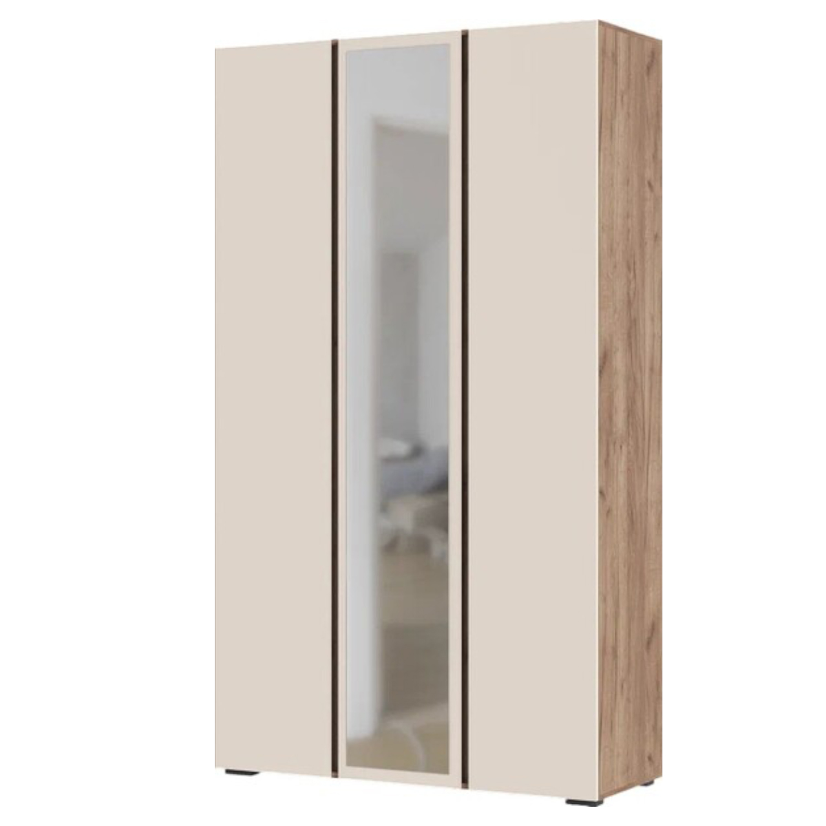 Трехстворчатый шкаф Хелен ШК 02 предназначен для организации хранения вещей, белья и одежды и найдет свое применение в спальне или детской. В его конструкции имеется пенальная секция с пятью полками и большой платяной отдел с металлической штангой для одежных вешалок. Центральная створка шкафа украшена большим зеркалом.