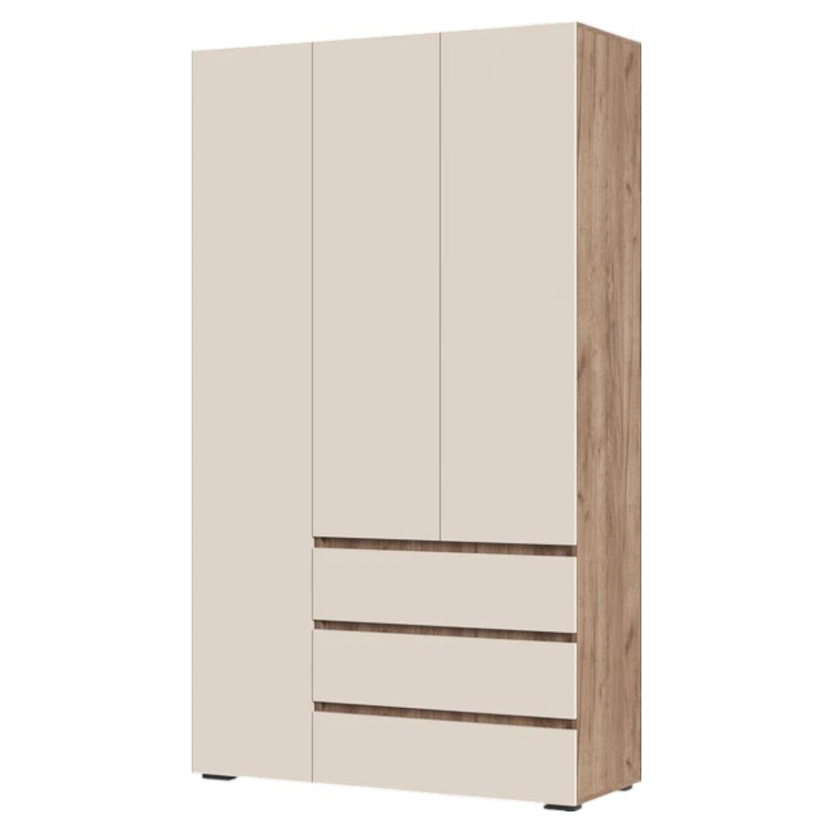 Шкаф оснащен тремя дверцами, за которыми располагается достаточно места для хранения одежды и различных предметов. Три вместительных выдвижных ящика.