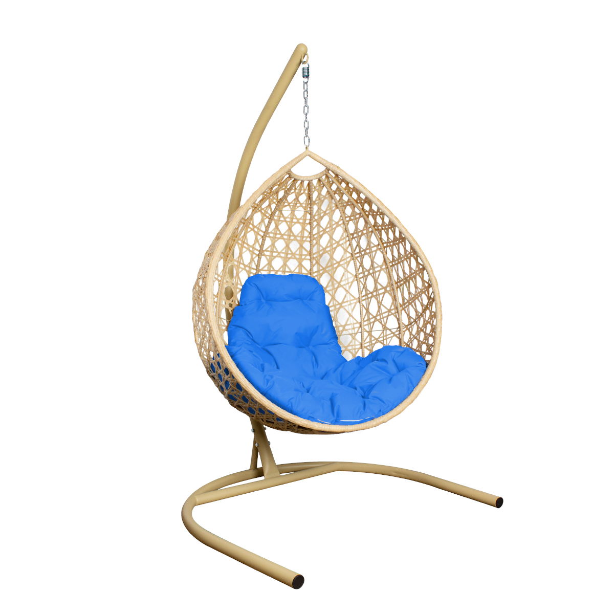Кресло подвесное Капля Люкс с ротангом бежевое, голубая подушка