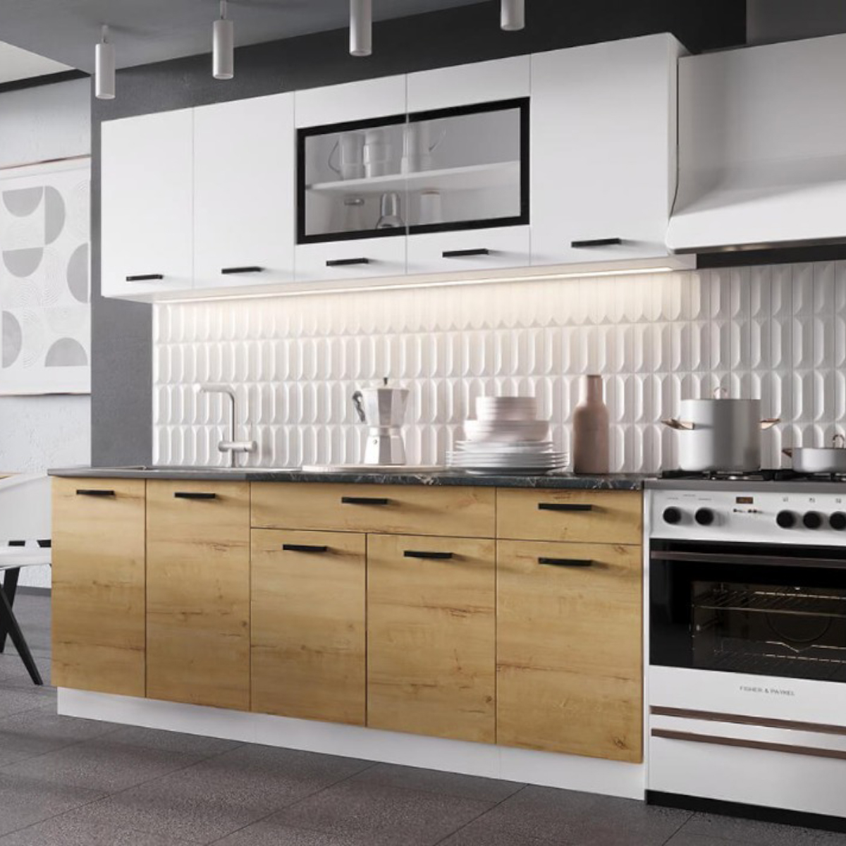 Кухня Брауни 2 м Белый гладкий/Дуб Вотан со столешницей Мрамор черный/Мальва