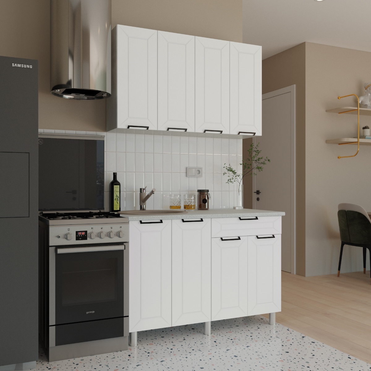 Кухня "Ривьера" - это воплощение современного дизайна и практичности. Она выполнена в стиле минимализма, что позволяет ей гармонично вписаться в любой интерьер. Корпус кухни изготовлен из качественного ЛДСП белого цвета с тиснением "Древесные поры". Этот материал устойчив к влаге и механическим повреждениям, что делает его идеальным выбором для кухонной мебели. Фасад кухни выполнен из МДФ, покрытого матовой пленкой ПВХ "Карбон Фарфор". Это придает кухне стильный и современный вид. Ручки СТ-3 добавляют особый шик и удобство использования. Стекло "Лабиринт" придает кухне легкость и воздушность. Роликовые направляющие обеспечивают плавное открывание ящиков, а петли без доводчика гарантируют надежность и долговечность конструкции.
