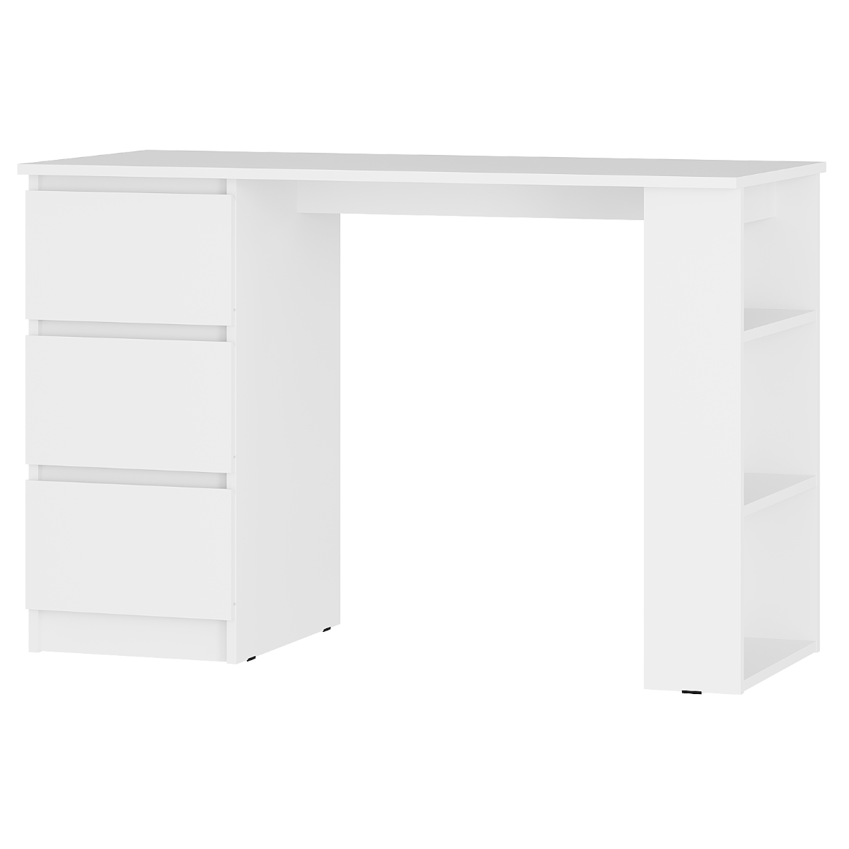 Тумба с тремя выдвижными ящиками на шариковых направляющих для школьных принадлежностей и три открытых полки собираются зеркально.