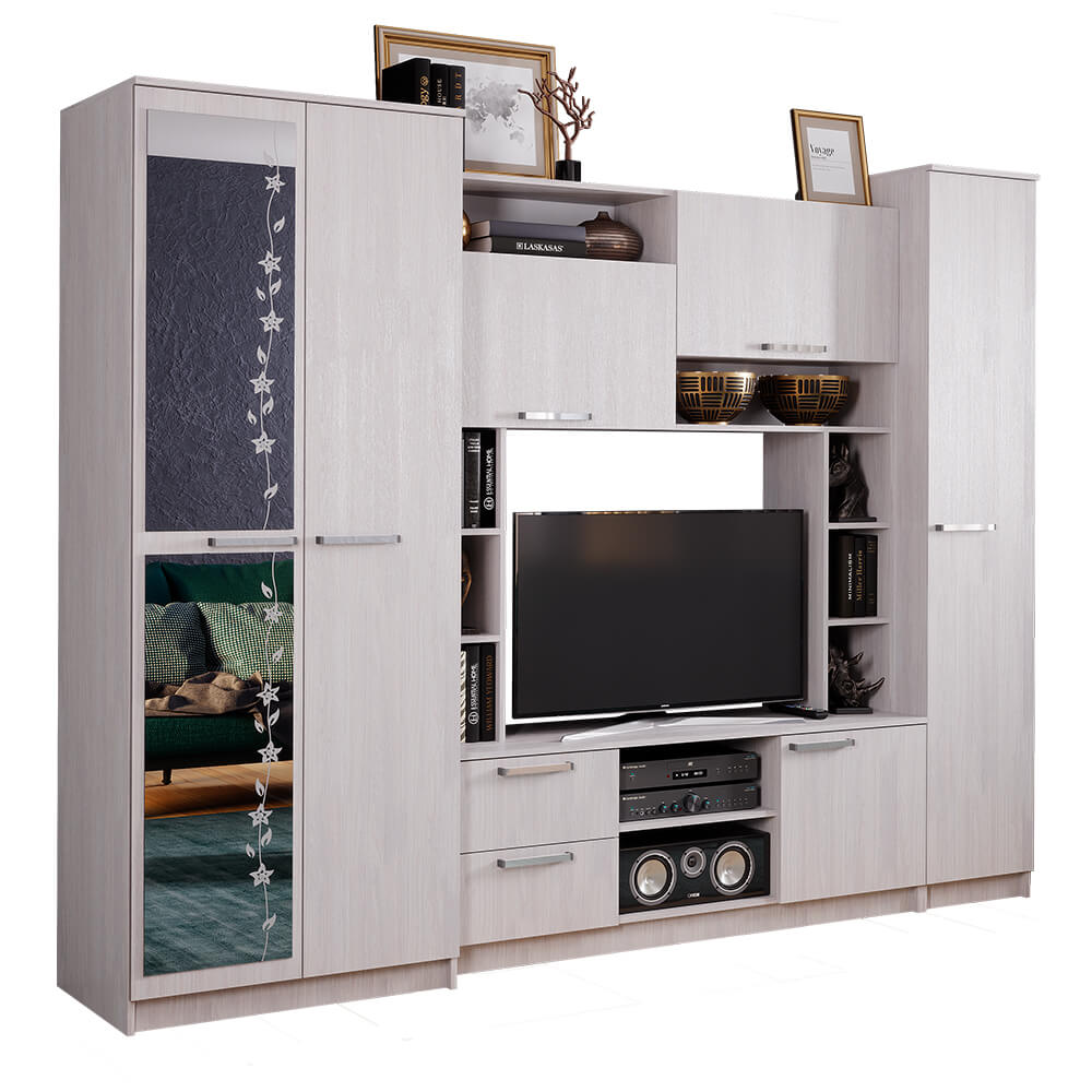 Корпус мебельной стенки выполнен в светлом тоне Ясень белый, что придаст конструкции гостиной элегантный вид, а зеркальная дверца с декоративным цветочным орнаментом визуально расширит пространство комнаты.