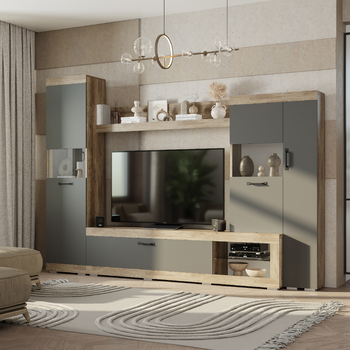 Благодаря своему детально продуманному наполнению конструкции, гостиная Тесла имеет разнообразные места для хранения: здесь и пенальные полки, чьи створки частично состоят из тонированного стекла, образующие витрину, и вместительные ниши за откидной створкой на барных газлифтах, и интерьерная верхняя полка, где эффектно разместятся любимые сувениры, рамки с фотографиями или элементы декора. Также большая ниша посреди мебельной стенки образует место для установки видео-панели и необходимой аудио-техники.