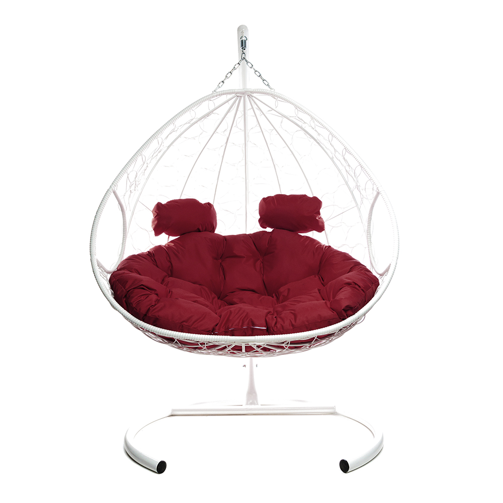 Кресло подвесное Для Двоих с ротангом белое, бордовая подушка