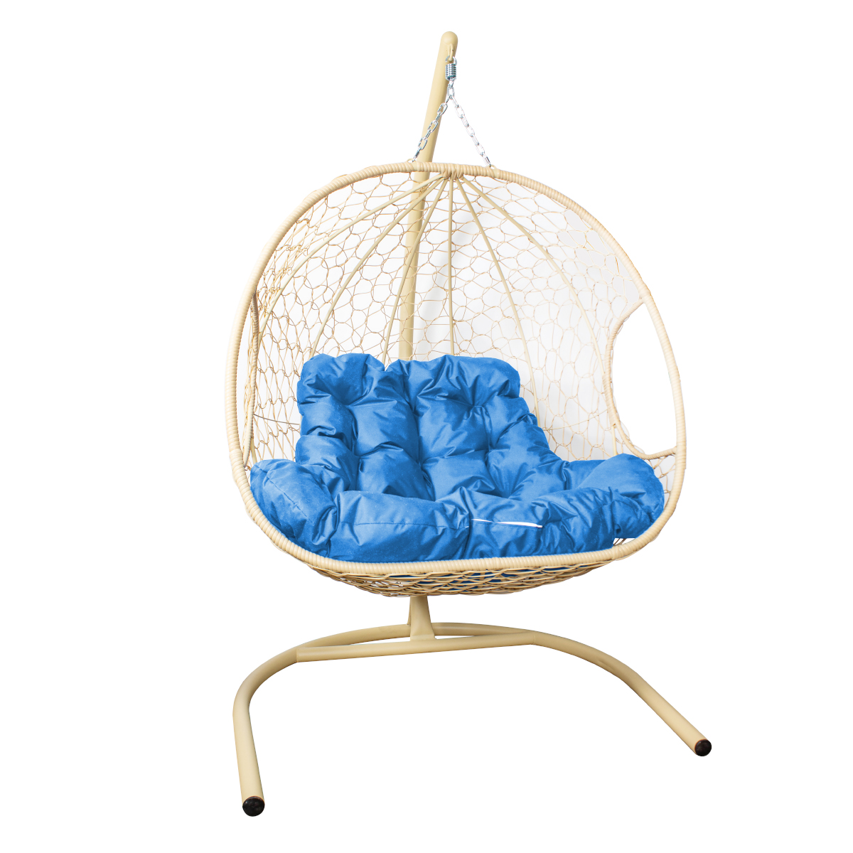 Кресло подвесное Для Двоих с ротангом бежевое, голубая подушка