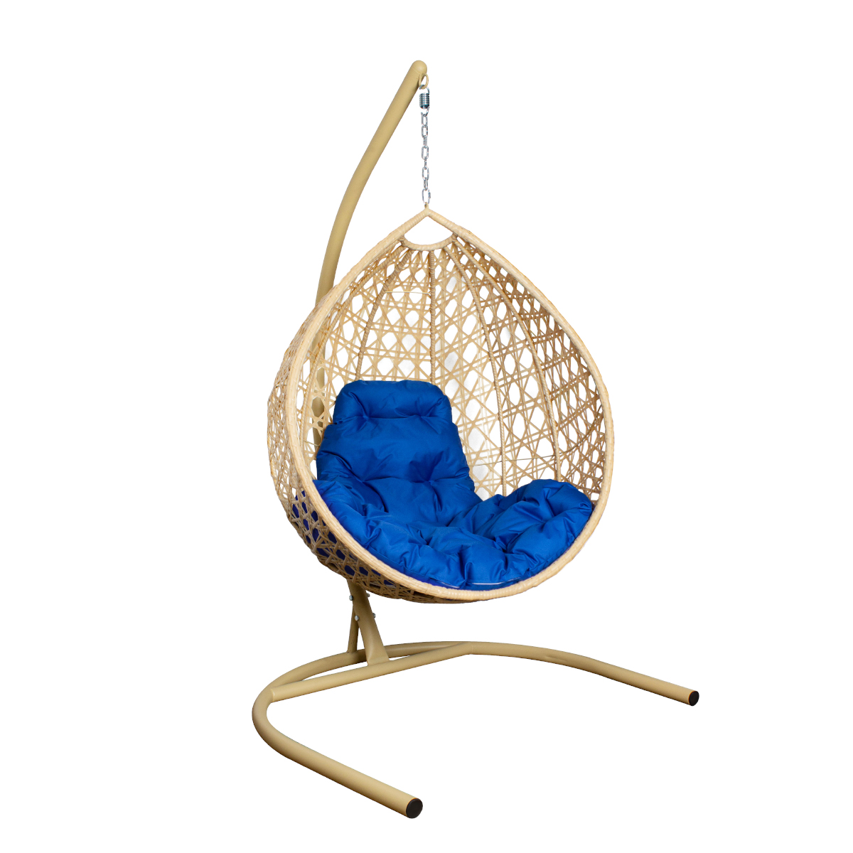 Кресло подвесное Капля Люкс с ротангом бежевое, синяя подушка