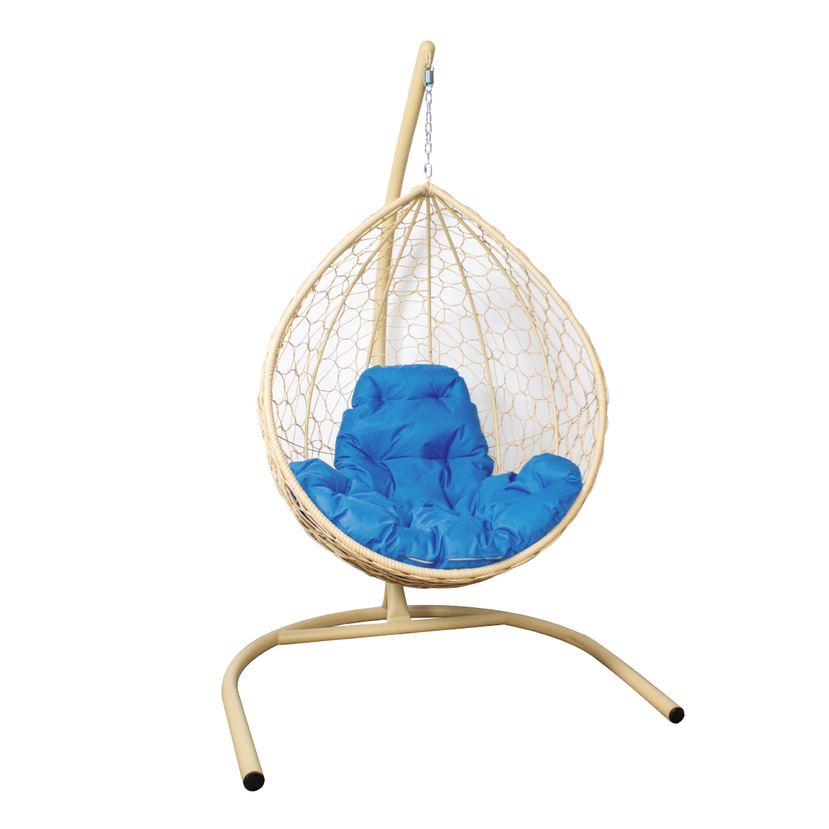 Кресло подвесное Капля с ротангом бежевое, голубая подушка