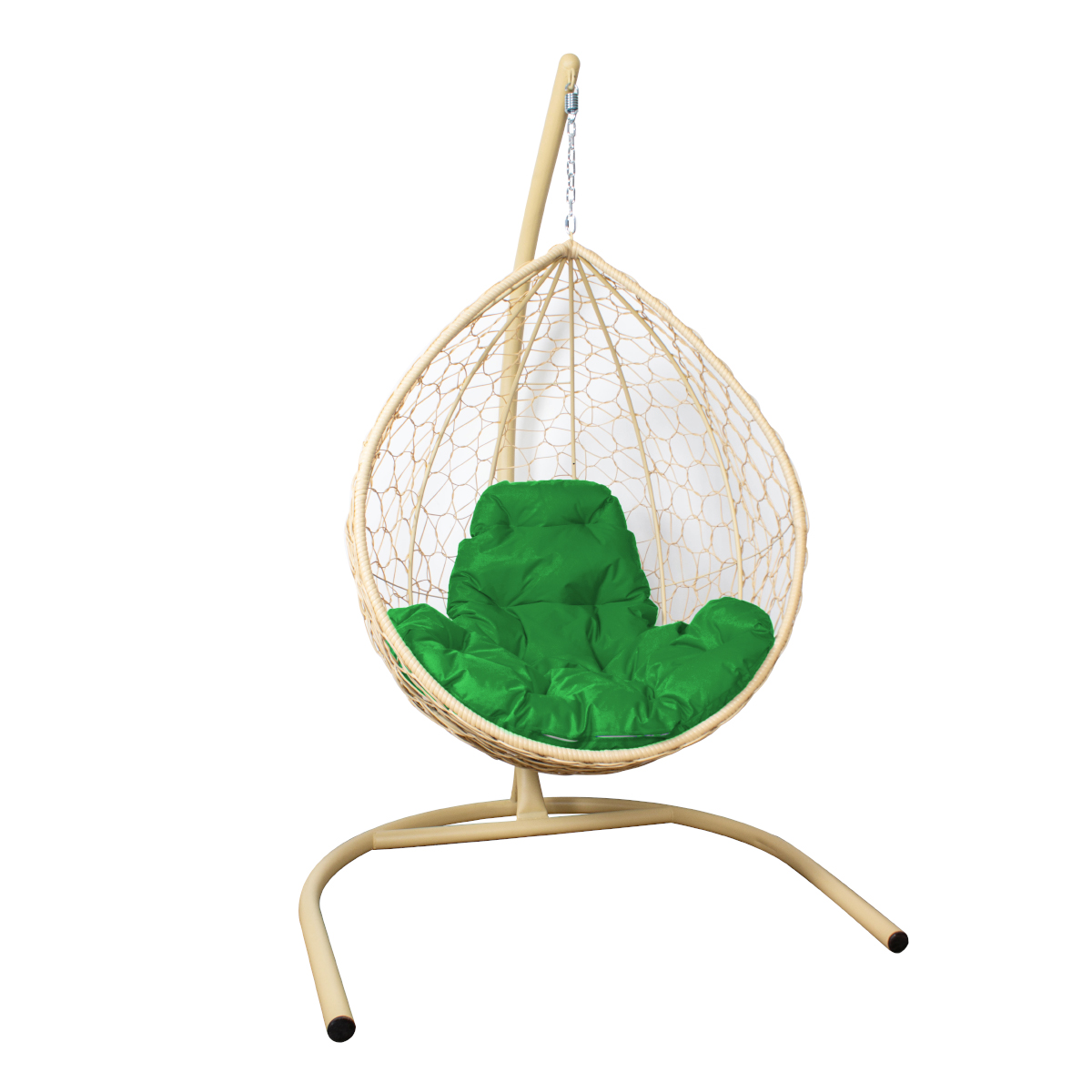 Кресло подвесное Капля с ротангом бежевое, зеленая подушка