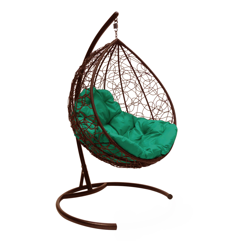 Кресло подвесное Капля с ротангом коричневое, зеленая подушка