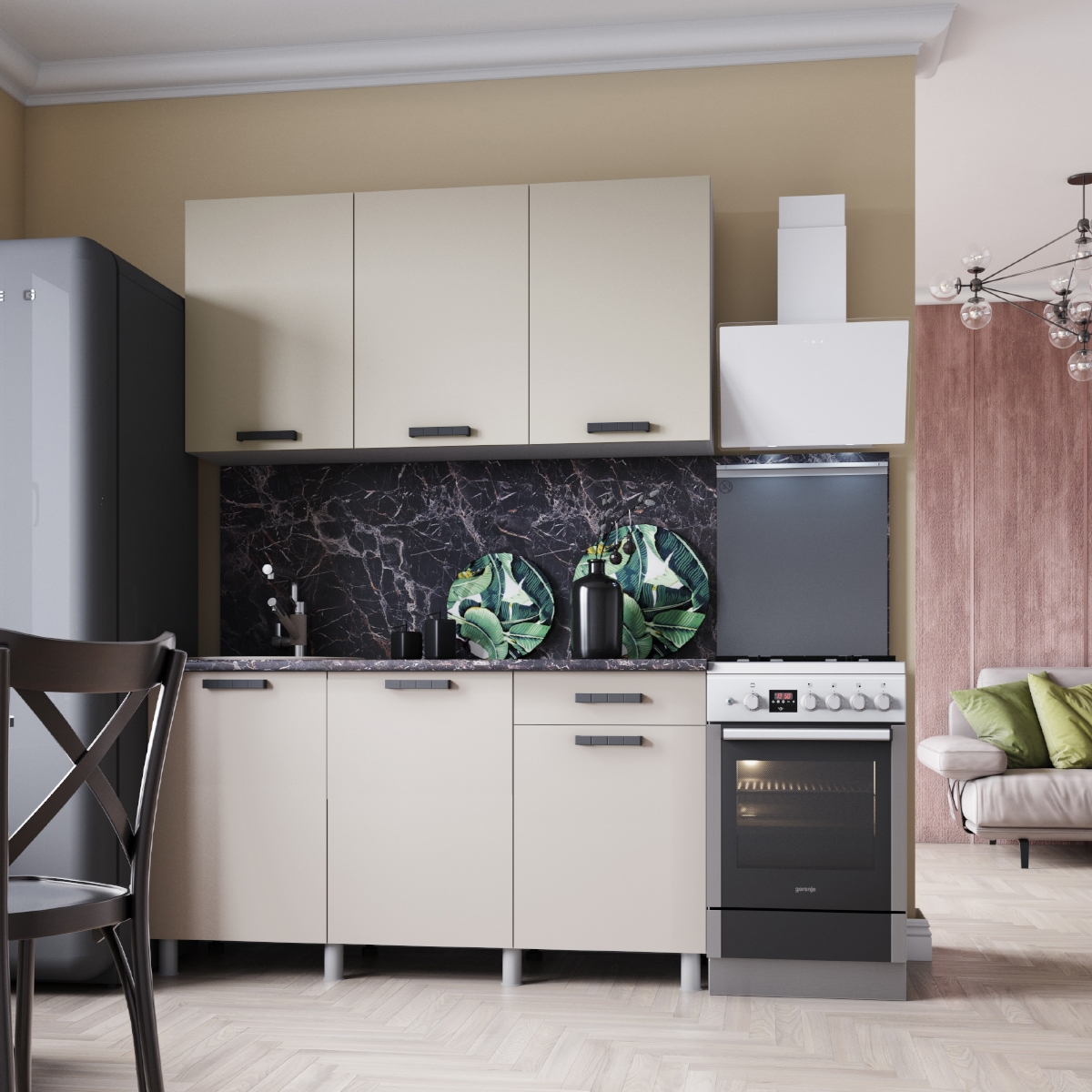 Столешница, плинтус для столешницы, посудосушитель, стеновая панель, мойка и цоколь приобретаются отдельно.