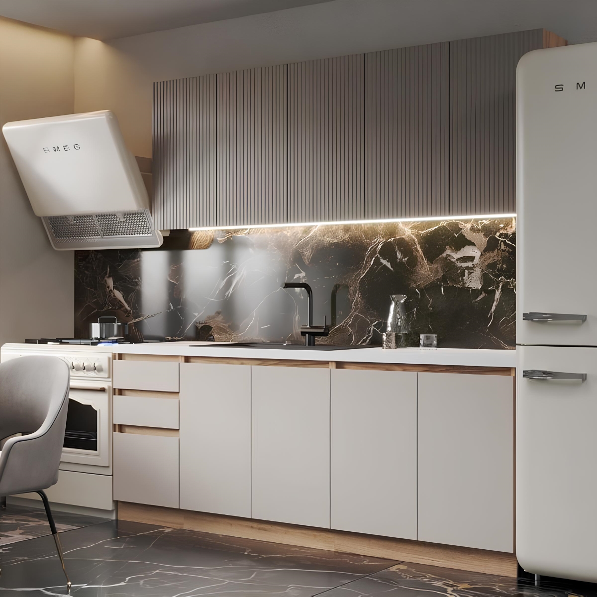 Кухня «Ника» - современная кухня, которая создает атмосферу универсальности. Главный акцент ставится на минимализм, что обеспечивает ее компактность и функциональность. При небольших габаритах в ней поместятся все предметы кухонного обихода.