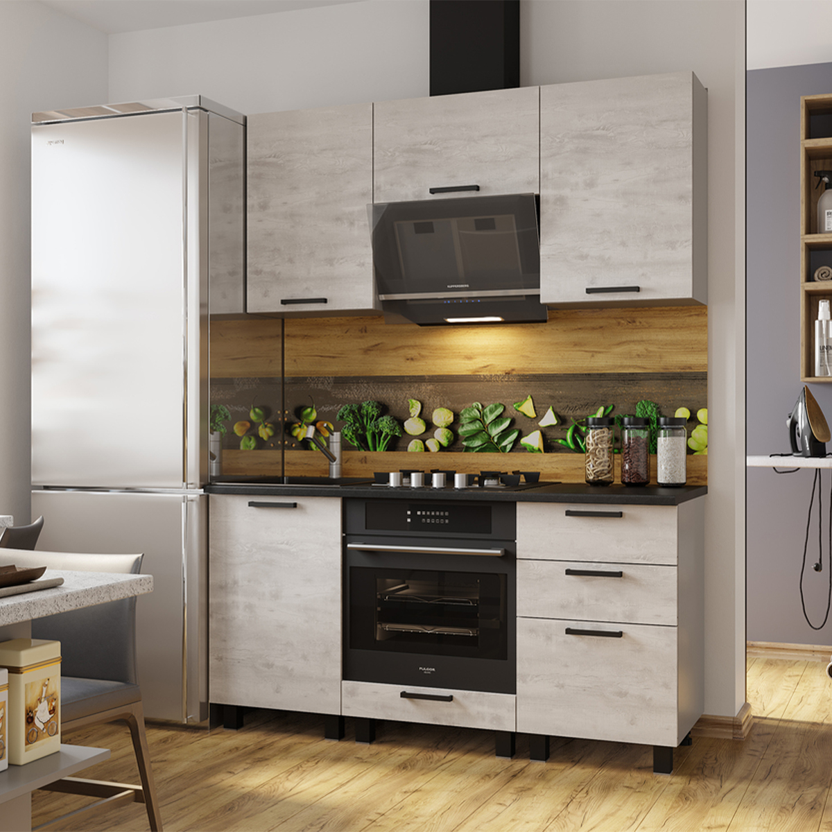 Кухонный гарнитур Сканди состоит из трех напольных модулей и трех навесных.