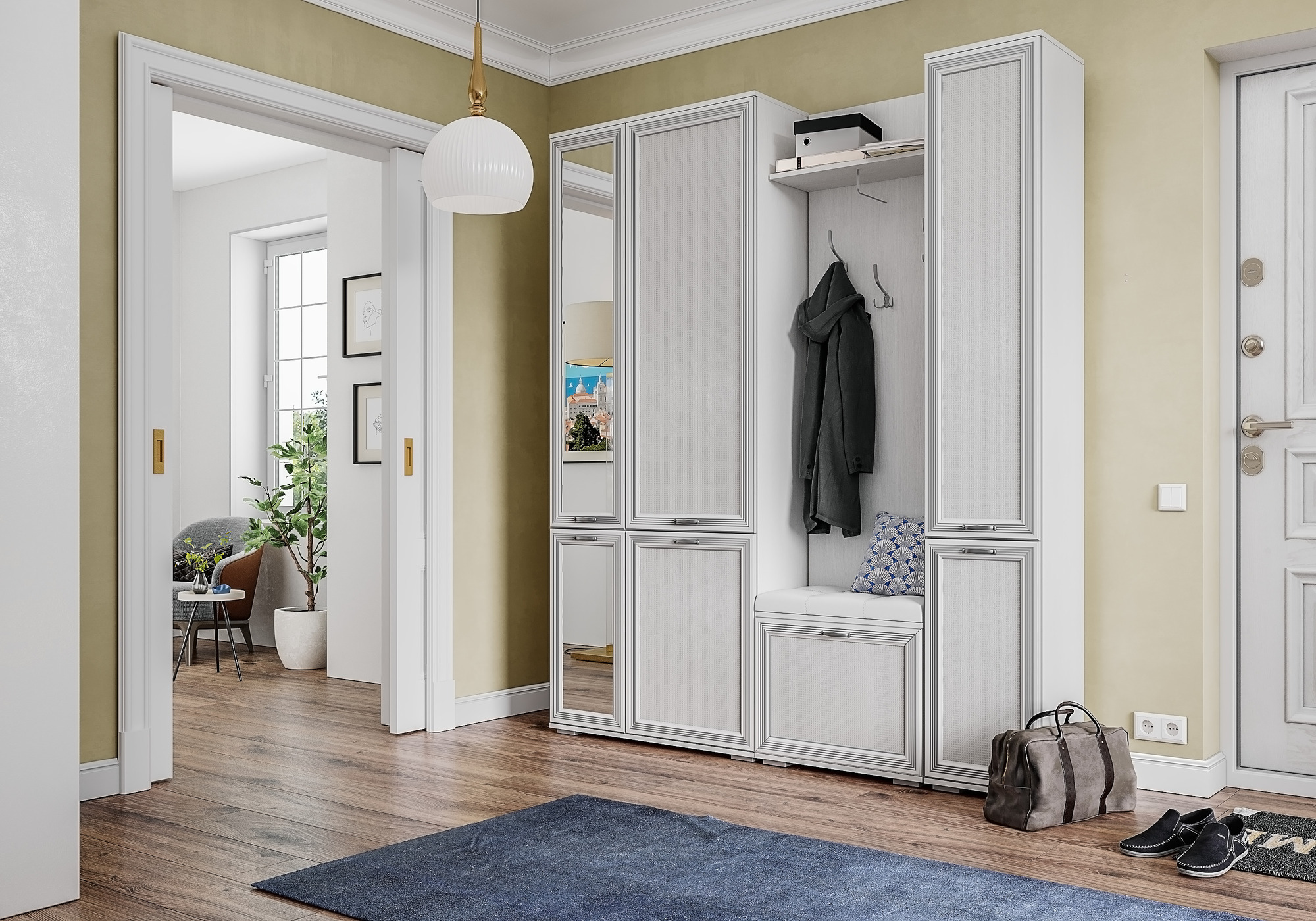 Особенности: Модули прихожей можно докомплектовывать шкафами от гостиной «Ливорно». Бока шкафов одной глубины с боковинами обувниц - 330 мм