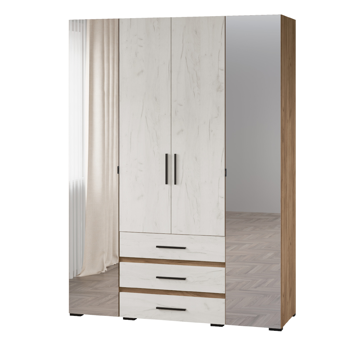 Модена МШ-24 представляет собой великолепный четырехстворчатый шкаф, предназначенный для хранения вещей, белья и одежды. Его комбинированная конструкция состоит из двух пенальных отсеков за боковыми зеркальными створками, трех выдвижных ящиков и платяной секции с вместительной полкой и металлической штангой для одежных плечиков.