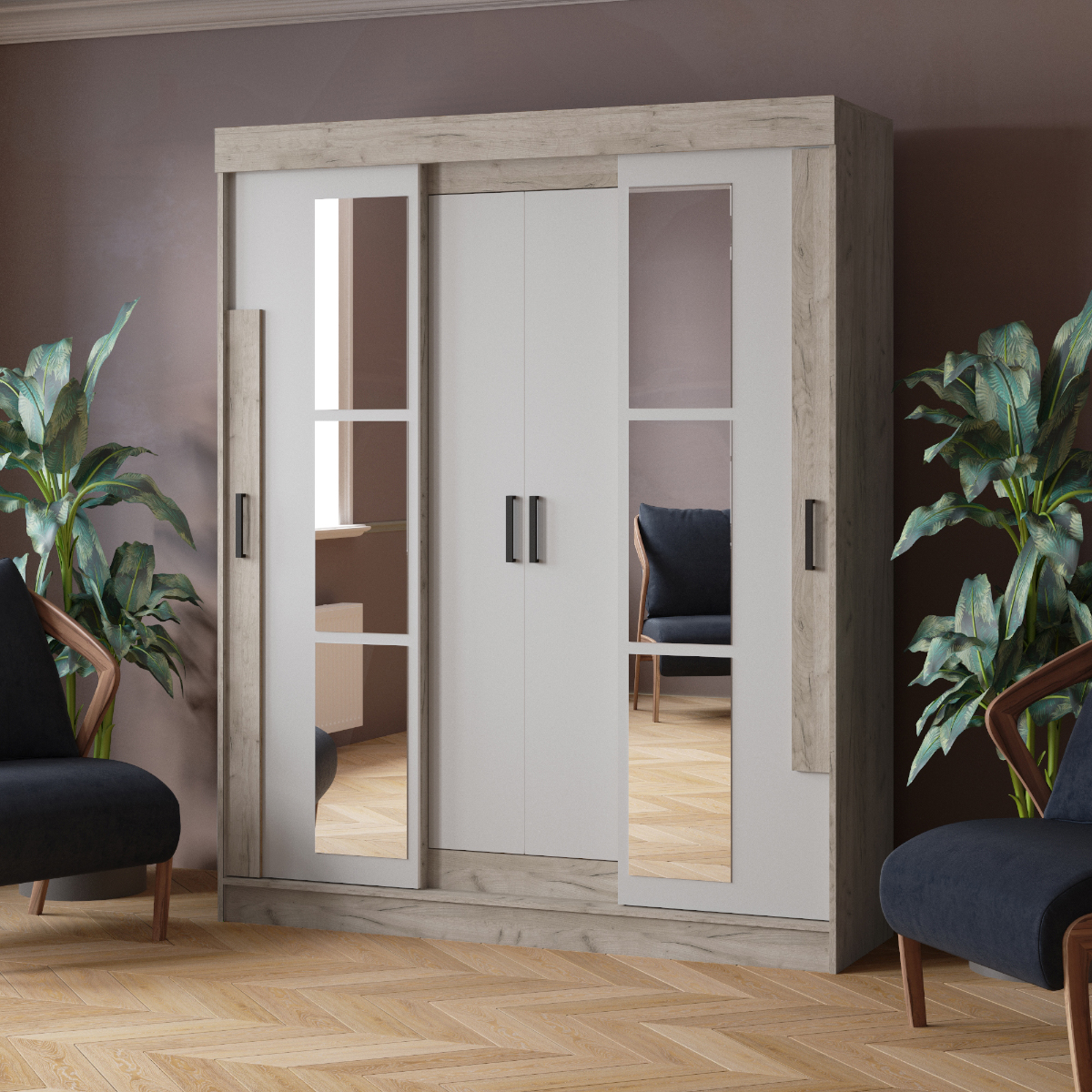 Визуально Шкаф-купе разделен на три секции за четырьмя раздвижными дверями, которые предоставляют доступ к четырем вместительным полкам в центре и двум платяным секциям по бокам. Каждая платяная секция имеет полку сверху и надежную стационарную штангу для вешалок с одеждой. Фасад украшен зеркалами, что не только придаст эффектности интерьеру и визуально расширит пространство, но и позволит вам оценить свой внешний вид при смене одежды.