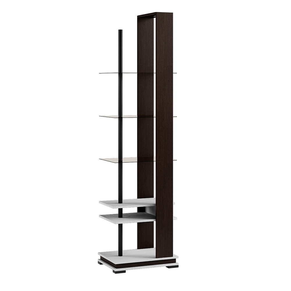 Модена МС-1 представляет собой высокий узкую конструкцию с открытыми ЛДСП и стеклянными полками, на которых можно красиво и удобно расположить свои любимые книги, сувениры фотографии или гаджеты, создавая уникальный интерьер в своем стиле.