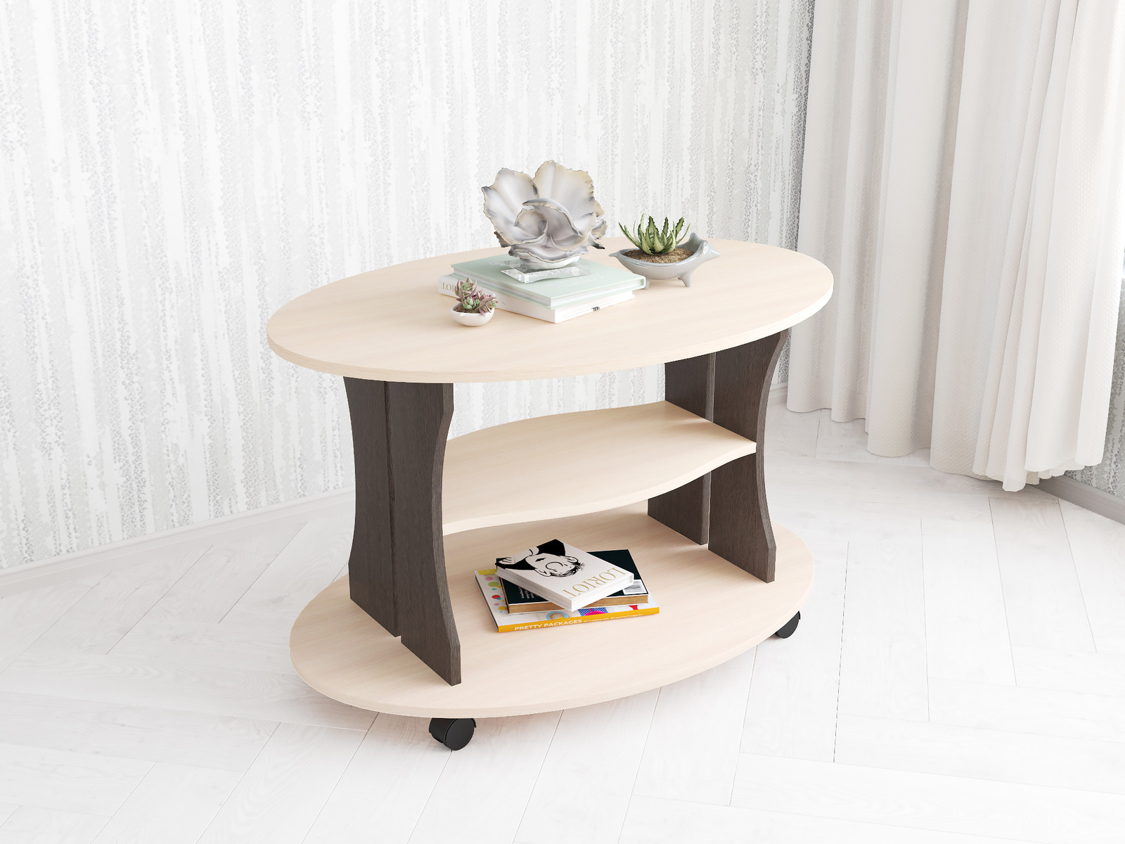 Столик Консул-1 обладает стильным и эффектным обликом благодаря гармоничным пропорциям и контрастному цветовому решению с текстурой обработанной древесины, а скругленная форма функциональной конструкции делает его удобным и безопасным. Наличие колесиков облегчит перемещение столика в более подходящее место при необходимости.