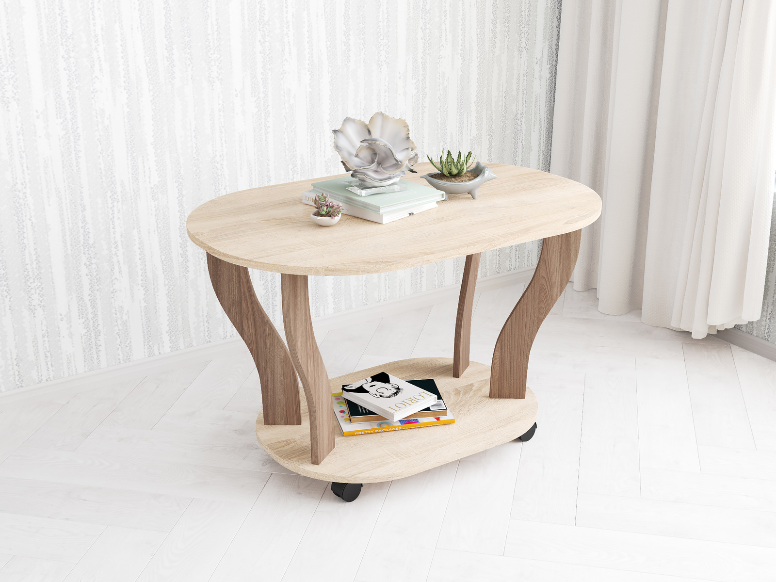 Столик Консул-3 владеет стильным и эффектным обликом благодаря гармоничным пропорциям и удачному цветовому решению с текстурой обработанной древесины, а овальная форма конструкции столешницы делает его удобным и безопасным. Колесная пара облегчит перемещение столика в более подходящее место при необходимости.