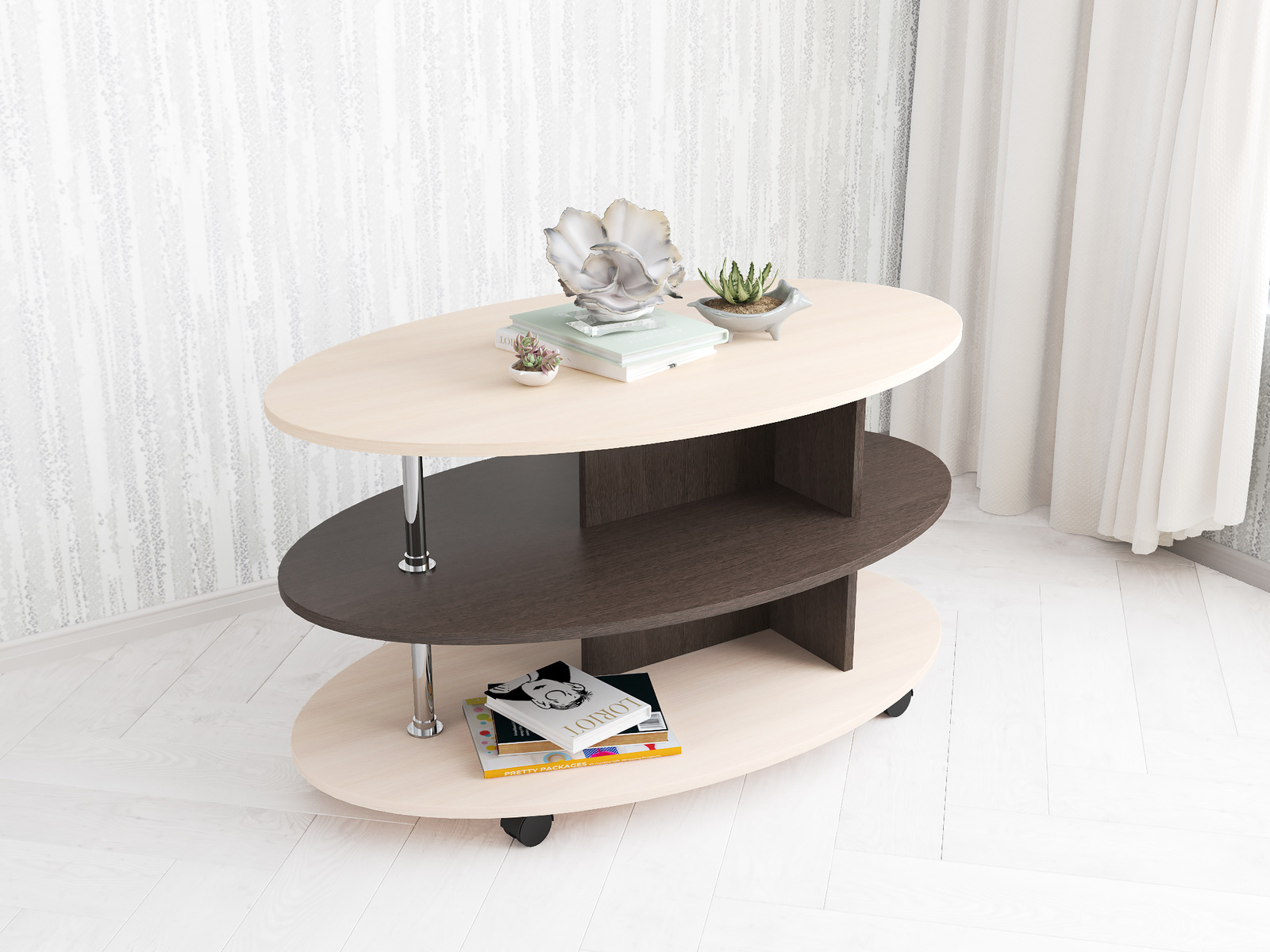 Столик Консул-4 обладает стильным и эффектным обликом благодаря гармоничным пропорциям и контрастному цветовому сочетанию с текстурой обработанной древесины и хромированного металла, а овальная форма функциональной конструкции делает его удобным и безопасным. Наличие колесиков облегчит перемещение столика в более подходящее место при необходимости.