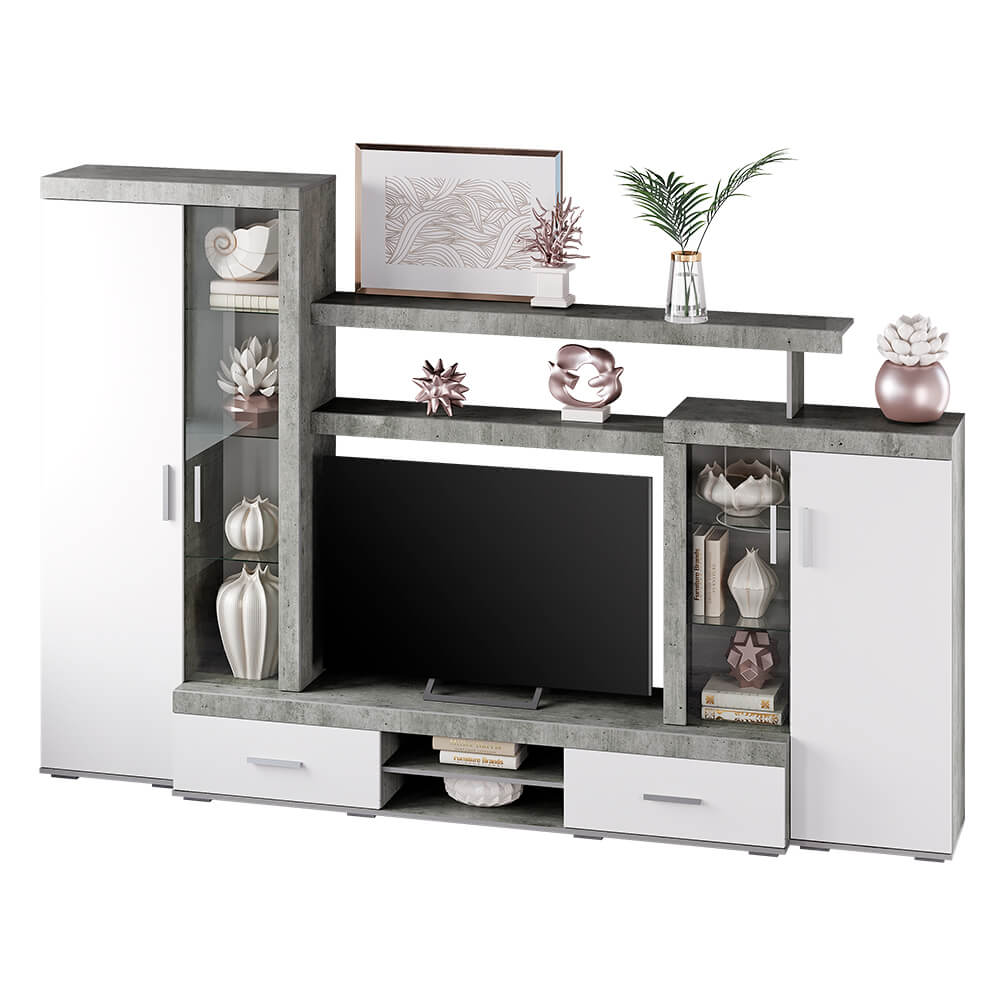 Гостиная Инстайл является частью одноименной модульной коллекции, все предметы которой идеально сочетаются между собой. Цвет бетон корпуса в комбинации с белыми фасадами и вставками из стекла придают гостиной Интсайл легкости. Два распашных шкафа, в один из которых встроена хромированная штанга, позволят разместить личные вещи и предметы гардероба