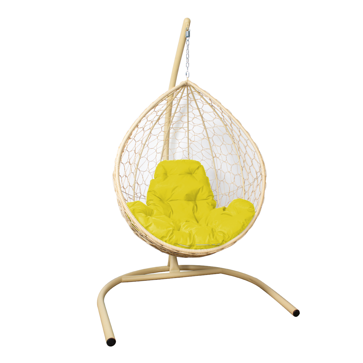 Кресло подвесное Капля с ротангом бежевое, желтая подушка