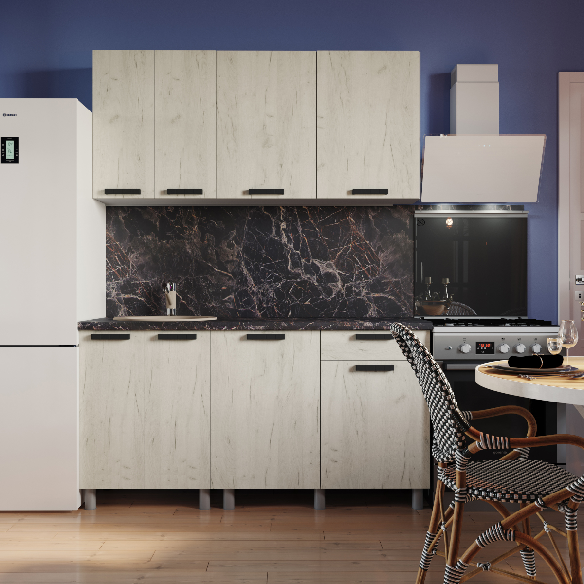 Роликовые направляющие и петли без доводчиков обеспечивают плавное и бесшумное открытие и закрытие ящиков и дверей. Это делает использование кухни максимально комфортным и удобным.