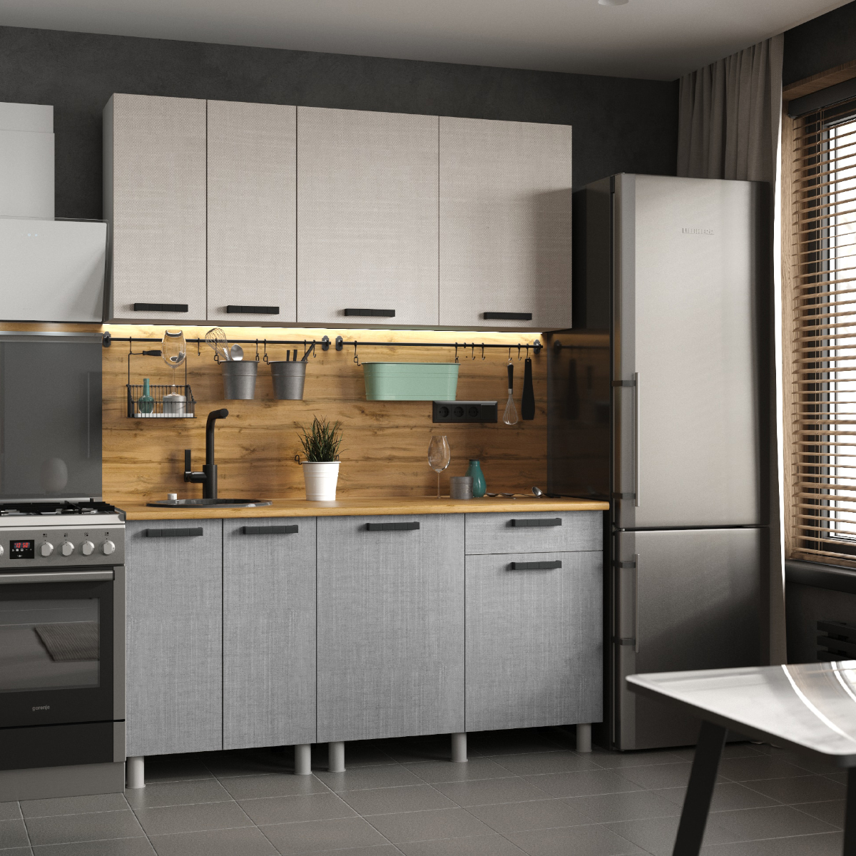 Фасад этой кухни удивительно приятен на ощупь и выполнен в естественных цветах. Он создан из высококачественной МДФ плиты с покрытием матовой ПВХ пленкой с имитацией ткани, которая легко моется и не сохраняет отпечатков от рук при использовании. Корпус шкафов кухни выполнен в белом цвете с тиснением "Древесные поры". Нижние модули установлены на современные регулируемые опоры.