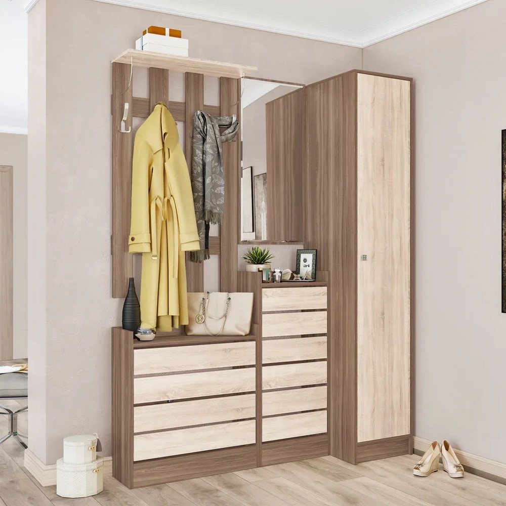 - Вешалка с большими крючками для верхней одежды, полкой и кронштейнами для аксессуаров;