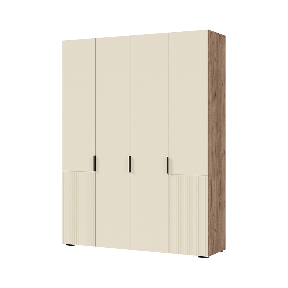 Шкаф с четырьмя створками обеспечивает удобный доступ к вещам, а продуманный внутренний раздел позволяет легко поддерживать порядок. Модель шкафа в центре разделена на полки, что позволяет удобно хранить постельное белье, одежду. Нижняя часть фасадов с вертикальной фрезеровкой создаёт красивый визуальный ритм, а простота и строгость форм подчеркивают современную классику
