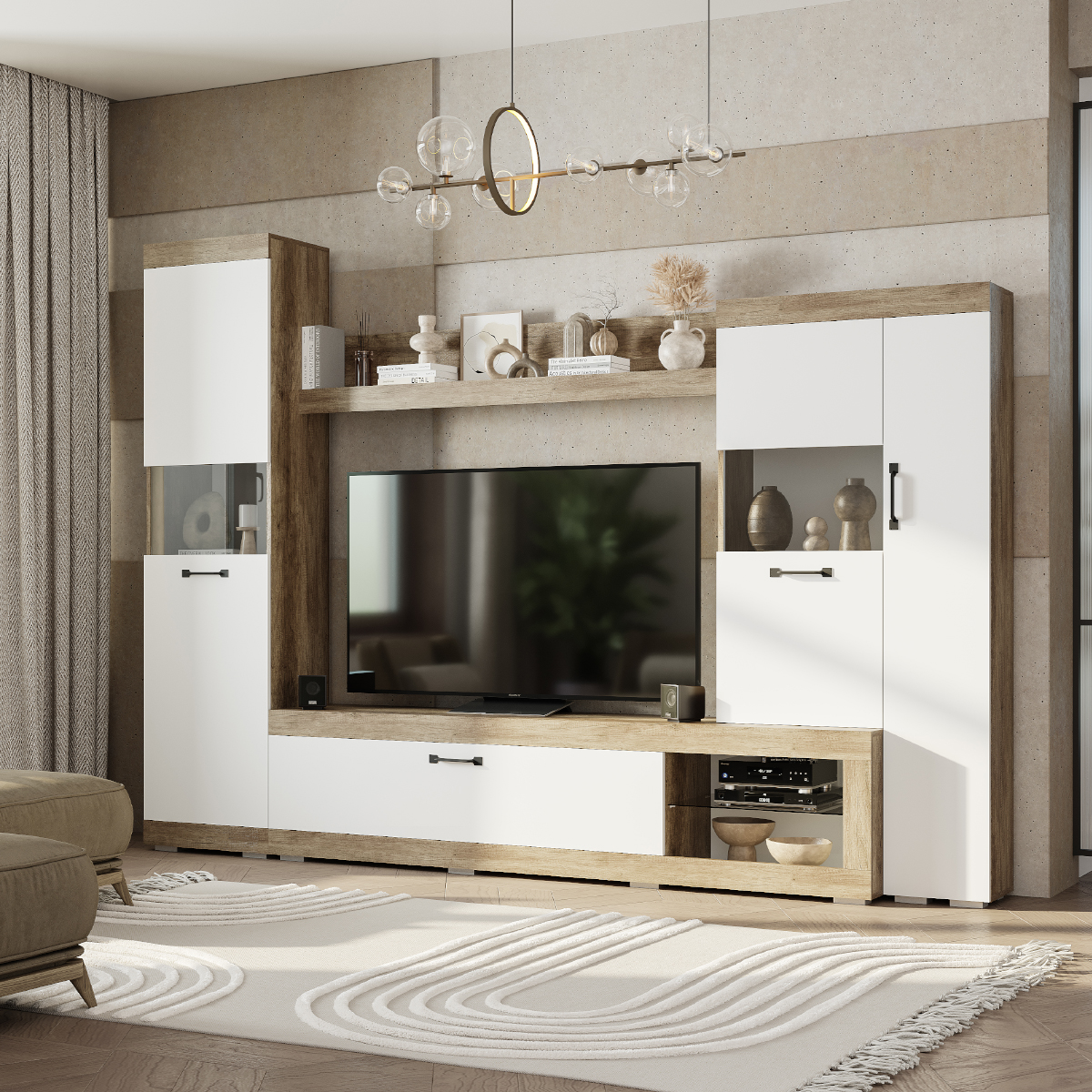 Благодаря своему детально продуманному наполнению конструкции, гостиная Тесла имеет разнообразные места для хранения: здесь и пенальные полки, чьи створки частично состоят из тонированного стекла, образующие витрину, и вместительные ниши за откидной створкой на барных газлифтах, и интерьерная верхняя полка, где эффектно разместятся любимые сувениры, рамки с фотографиями или элементы декора. Также большая ниша посреди мебельной стенки образует место для установки видео-панели и необходимой аудио-техники.