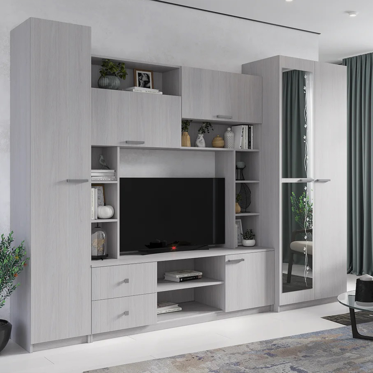 Гостиная "Марта М" - это самый лучший выбор для тех, кто ценит качество, прекрасный дизайн, где стиль, пропорции, декор доведены до совершенства, что делает мебель настоящим произведением искусства. Вместительная гостиная создана для всей семьи, в ней предусмотрены места для хранения разных размеров: глубокие полки в шкафу-пенале, выдвижные ящики, ниши за откидными дверцами и открытые полочки для мелочей и сувениров. В центре предусмотрена большая ТВ-ниша, а в глубоком шкафу удобно расположится верхняя одежда, особенно крупная: зимние куртки и пальто. Широкие плоские ручки безопасны, при этом удобны для взрослых и детей. На одной из дверей платяного шкафа есть большое зеркало с цветочным рисунком. Современный стильный комплект станет удачным интерьерным решением для вашей гостиной. Сочетание светлых и темных природных оттенков помогут оформить привлекательную и практичную обстановку.