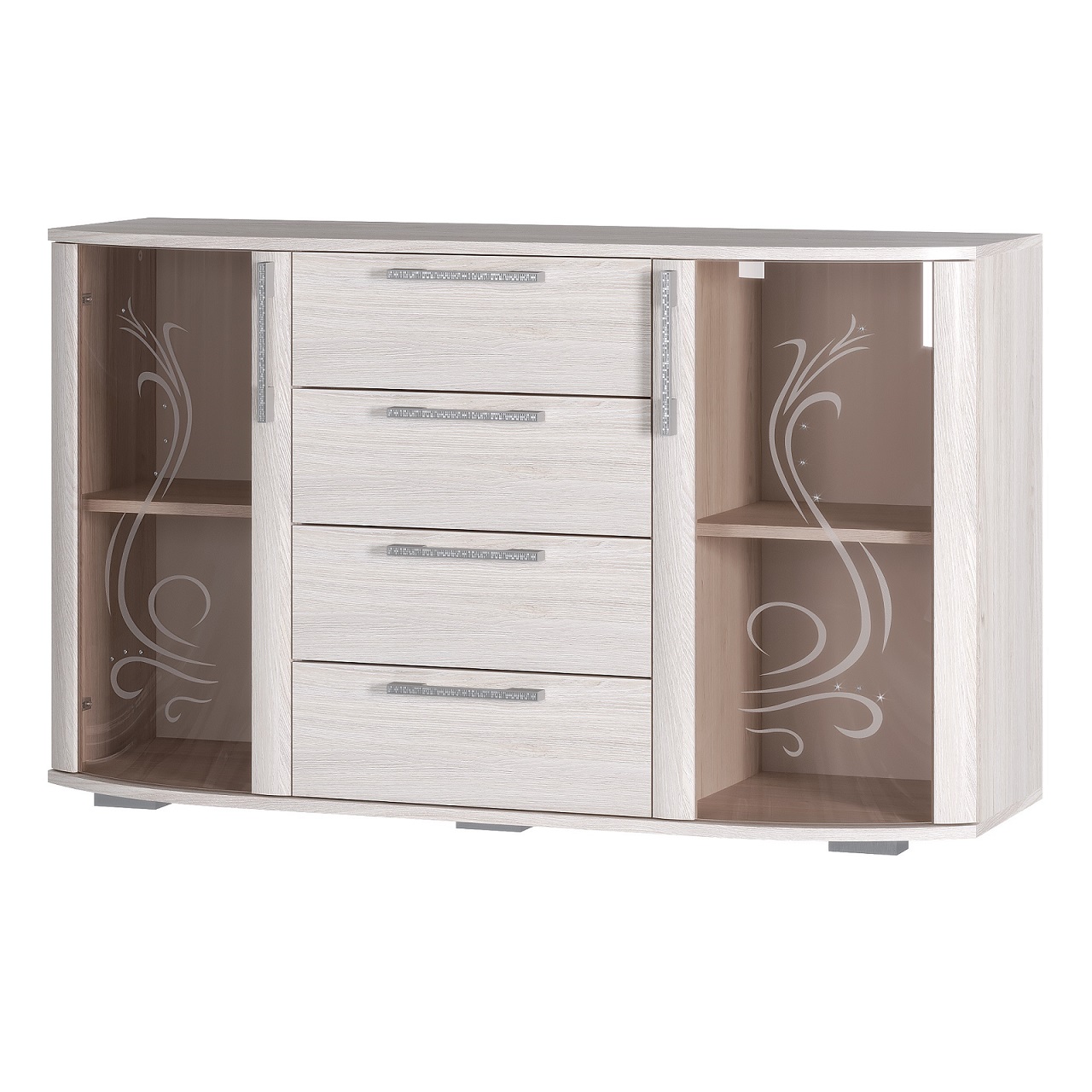 Комод с изящным пескоструйным узором на гнутых стеклостворках мерцает благодаря стразам Swarovski. Этот комод станет украшением Вашего дома и удачно впишется в любой интерьер.