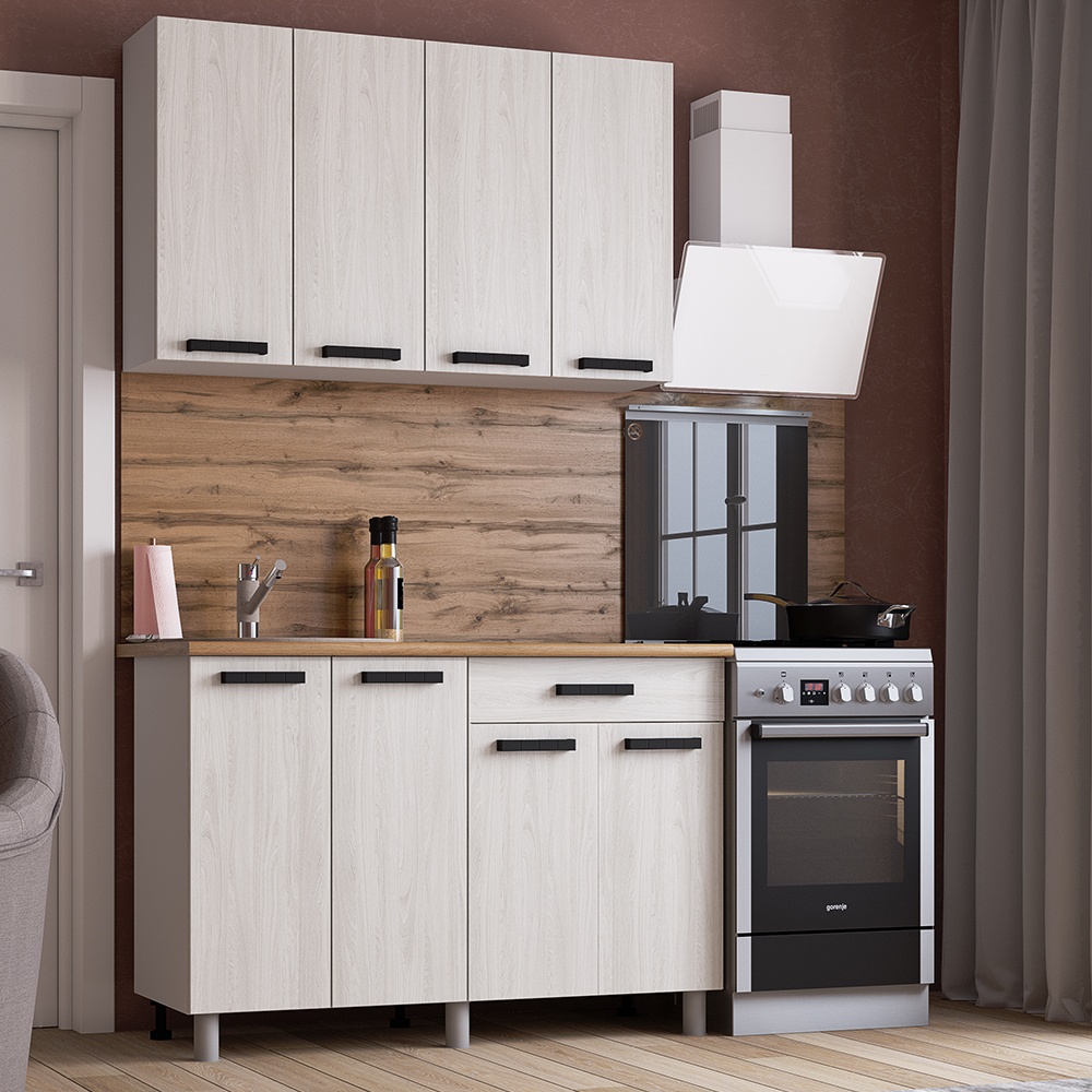 Фасад кухни создан из надежной ЛДСП плиты, повторяющей узор натурального обработанного дерева. Корпус шкафов кухни выполнен в белом цвете с тиснением "Древесные поры". Нижние модули установлены на современные регулируемые опоры.