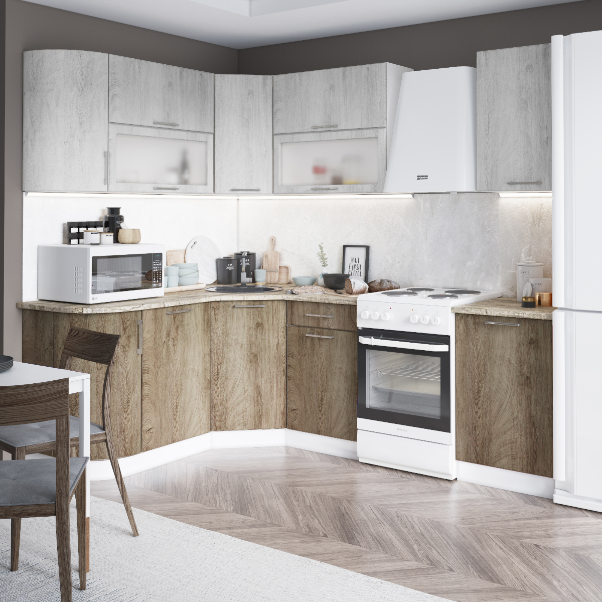 Полная модульная программа подразумевает под собой наличие радиусных верхних и нижних шкафов для окончания композиции кухни.