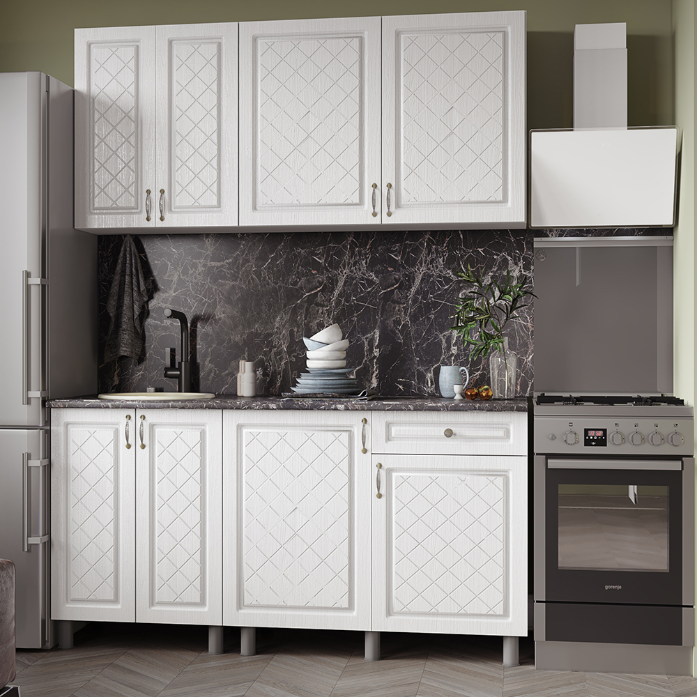 Словно воздушная, кухня Версаль выполнена в нежных оттенках, а фасады изысканно декорированы фрезерованным рисунком. Это готовое решение поможет вам организовать обстановку кухни с максимальной эргономичностью, в то же время преображая интерьер, позволяя пространству выглядеть более просторным.