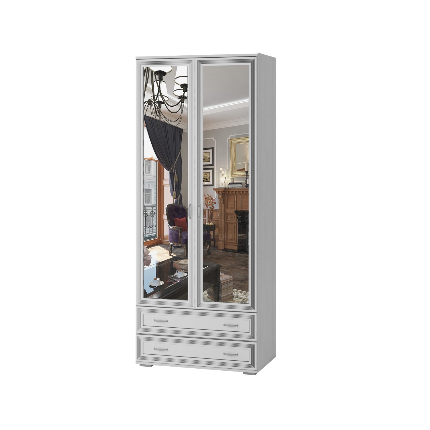 Двустворчатый шкаф ЛШ-23 создан в духе серии Ливорно и обладает комбинированной конструкцией, которая позволит практично и удобно разместить ваши вещи, белье и одежду: за створками располагается платяной отдел с одной вместительной полкой и металлической штангой для плечиков с одеждой, а ниже расположились один над другим два выдвижных ящика. Створки шкафа украшены зеркальными панелями, а петли с доводчиками и бесшумные шариковые направляющие станут незаметной, но приятной деталью.