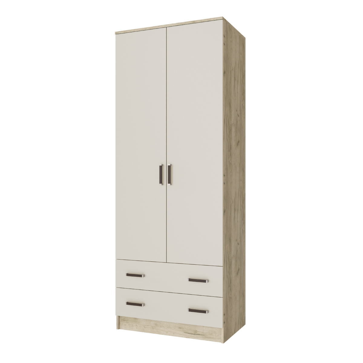 Шкаф предназначен для организации хранения вещей, одежды или белья, и для этого у него есть два выдвижных ящика снизу и платяная секция за двумя распашными дверями: в ней вы найдете вместительную полку и стационарную металлическую штангу для одежных вешалок. Шкаф изготовлен из экологически безопасных и качественных материалов, что гарантирует долговечность, удобство эксплуатации и легкий уход за поверхностью.