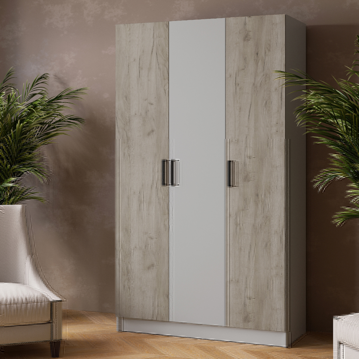 Шкаф Ларс (1,2) имеет три распашные двери с контрастными черными ручками и разделяется на две секции: одна содержит две вместительные полки и стационарную горизонтальную штангу для вешалок с одеждой, а другая - из пяти полок, расположенных одна над другой. Этот платяной шкаф изготовлен из надежной и долговечной ЛДСП: качественные и экологически безопасные материалы гарантируют безопасность и легкий уход за мебелью.