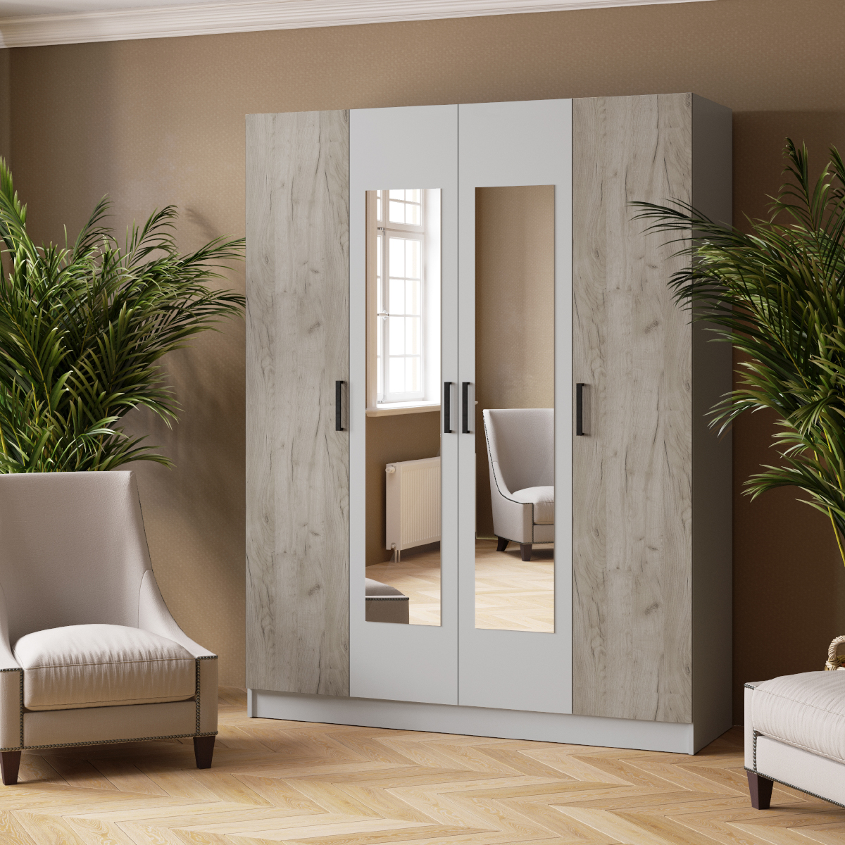 Комбинированный шкаф Ларс 1,6 предназначен для размещения ваших вещей, белья, одежды и, благодаря вместительному содержимому и функциональному наполнению, превосходно справится с этим. Он исполнен в классическом стиле, натуральных цветах и с привлекательной фактурой натурального дерева, а два фасадных зеркала помогут вам при смене одежды и визуально расширят пространство комнаты.