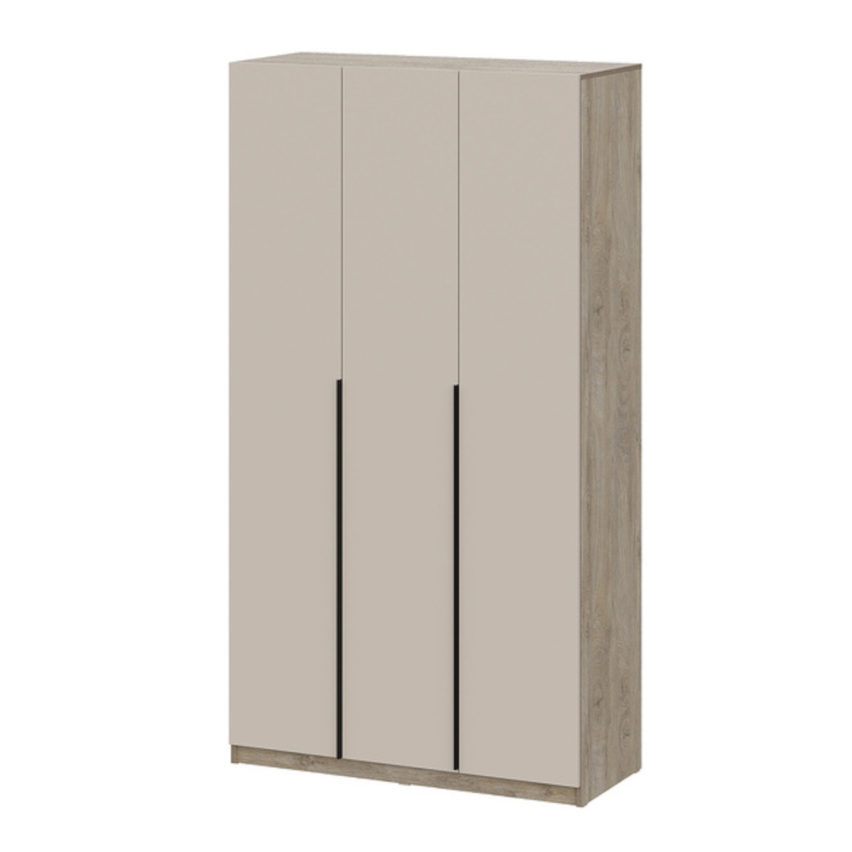 Шкаф: 3 распашных створки, 2 секции : в левой секции расположены 4 полки (3 полки съемные). В правой более широкой секции располагается штанга и вязка над штангой.