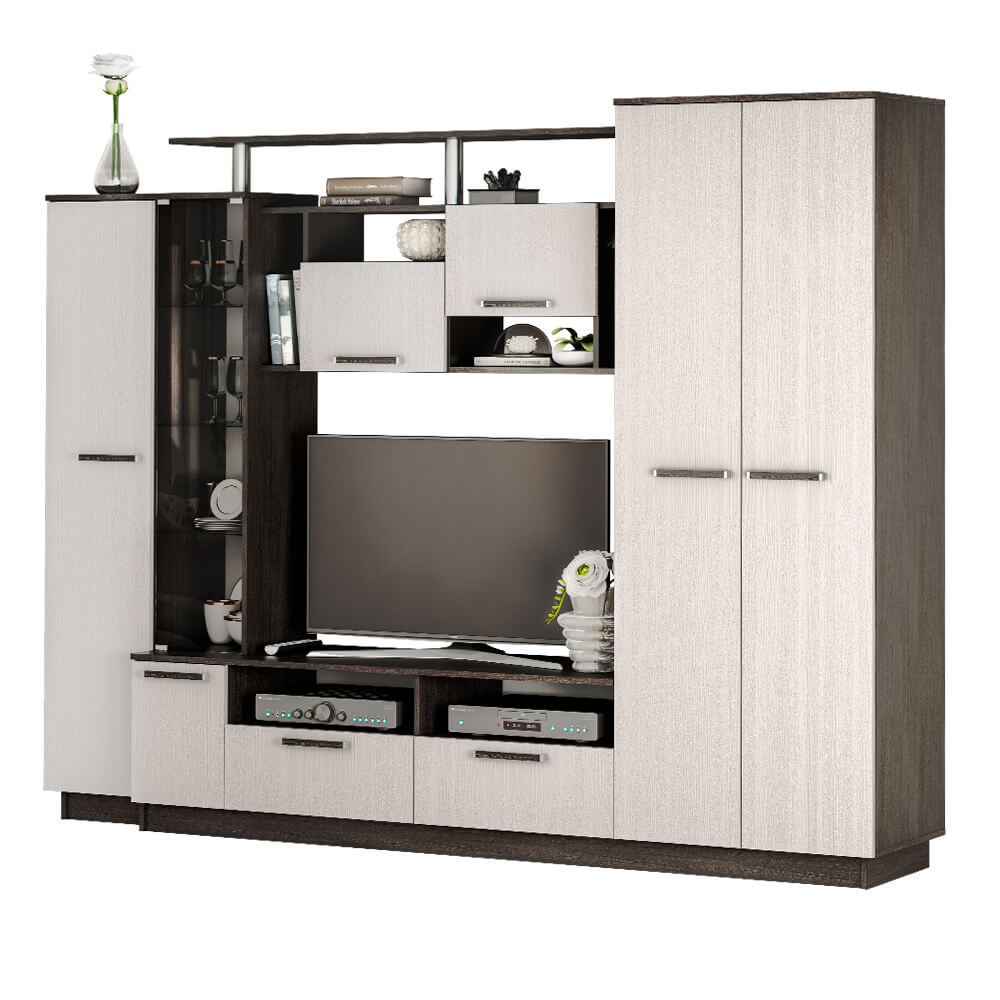 Гостиная "Вега" – стильная модель, сочетающая в себе красоту и практичность. На многочисленных полках и в закрытых ящиках вы сможете разместить необходимые предметы декора, документы или книги. А наличие распашного шкафа со штангой позволит хранить одежду. Светлые фасады в цвете лоредо в данной модели придадут свежести любому интерьеру.
