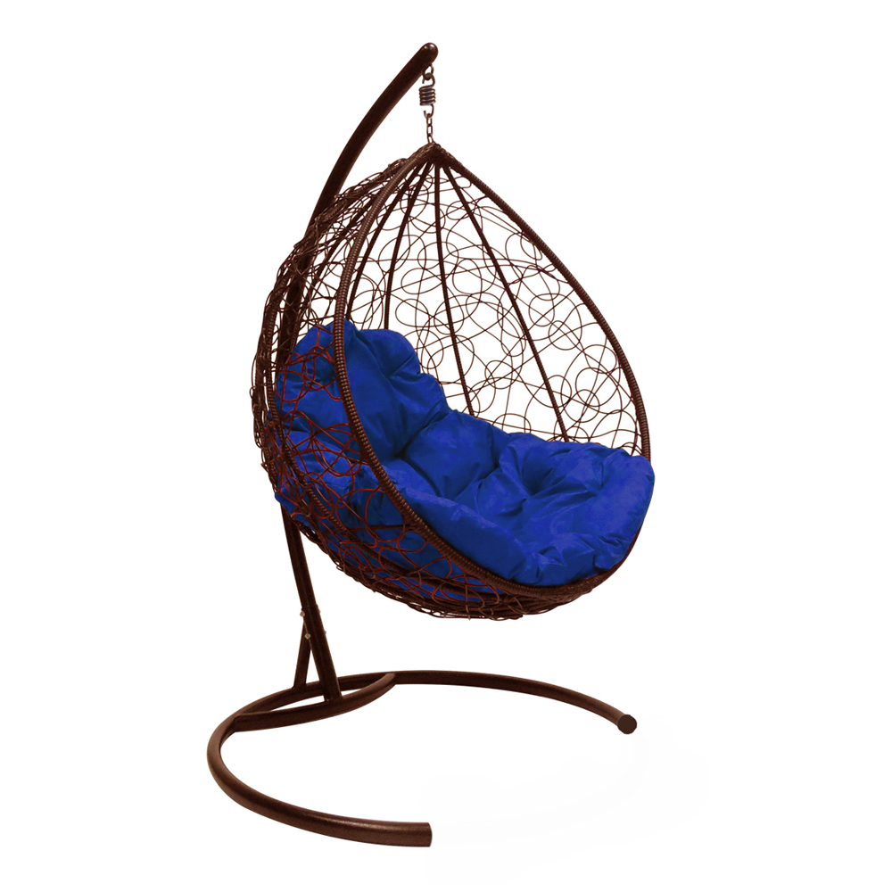 Кресло подвесное Капля с ротангом коричневое, синяя подушка