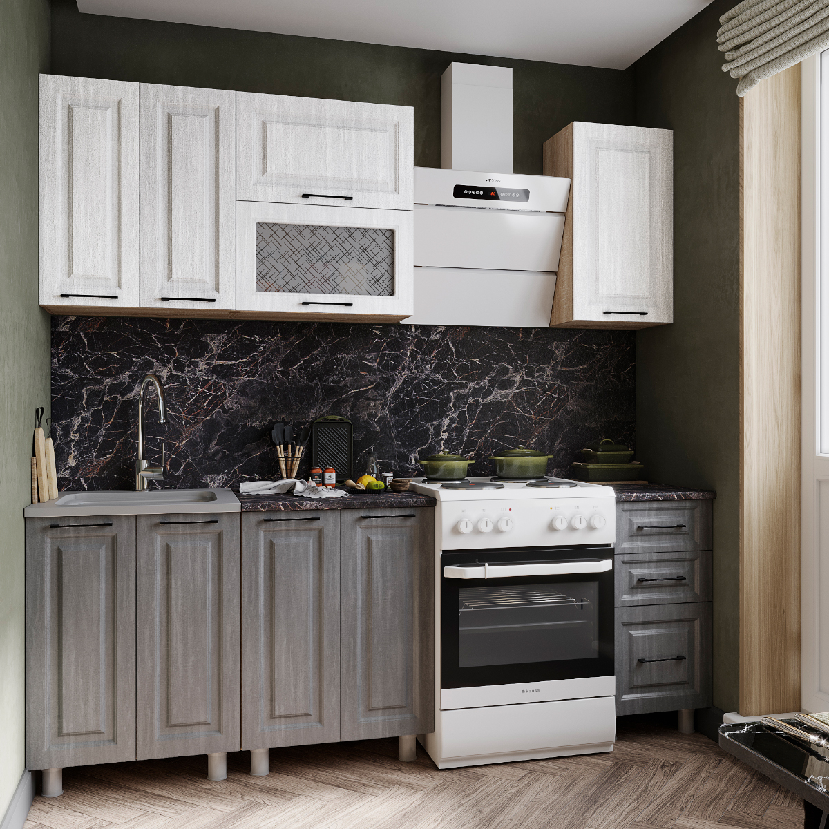 Материал фасада: верх - МДФ в пленке ПВХ Холст Белый «Greenwood», низ - МДФ в пленке ПВХ Холст грей «Greenwood»