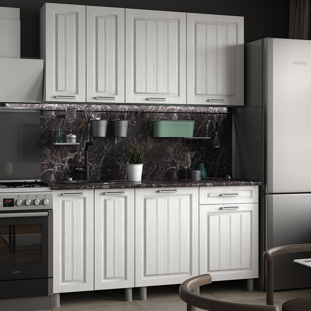 Декоративно фрезерованный фасад кухни Луксор создан из высококачественной МДФ плиты, покрытой матовой ПВХ пленкой в теплых, естественных цветах. Корпус модулей кухни выполнен в белом цвете с тиснением "Древесные поры". Нижние модули установлены на современные регулируемые опоры.