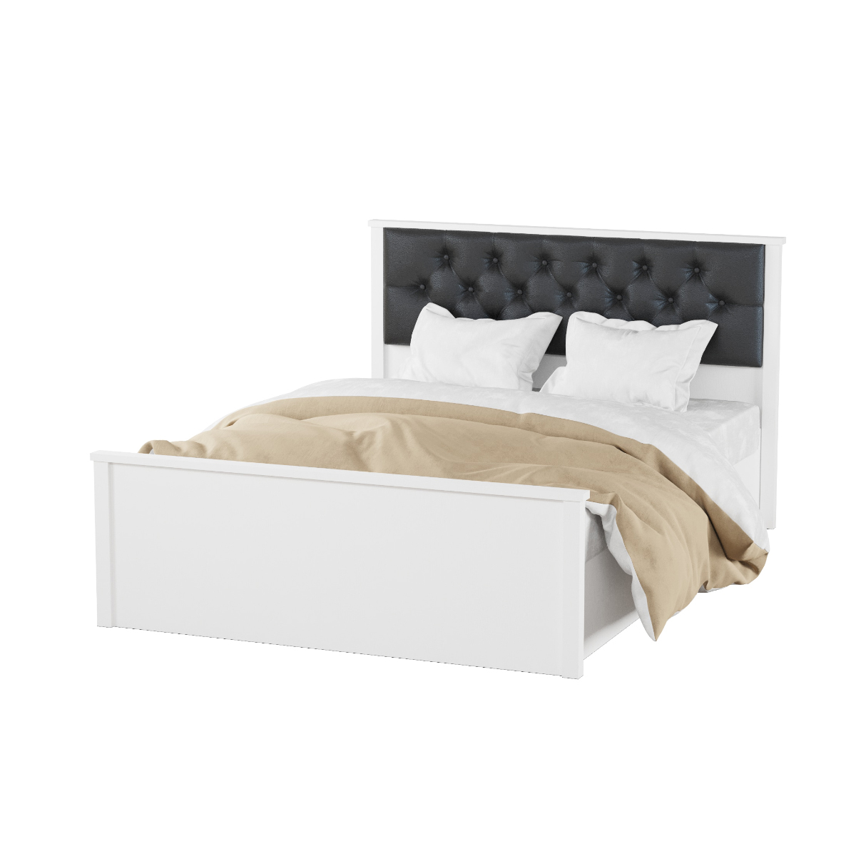 Двуспальная кровать Модена МКР-2 по достоинству станет центральным акцентом спальни: гармоничные пропорции, монументальный корпус в пол, высокое изголовье с мягкой обивкой из экокожи, декорированное изящной стяжкой, а изножью из ЛДСП щита добавляет фактурность и объем МДФ рамка в цвет корпуса.
