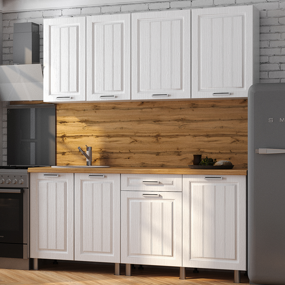 Декоративно фрезерованный фасад кухни Луксор создан из высококачественной МДФ плиты, покрытой матовой ПВХ пленкой в теплых, естественных цветах. Корпус модулей кухни выполнен в белом цвете с тиснением "Древесные поры". Нижние модули установлены на современные регулируемые опоры.